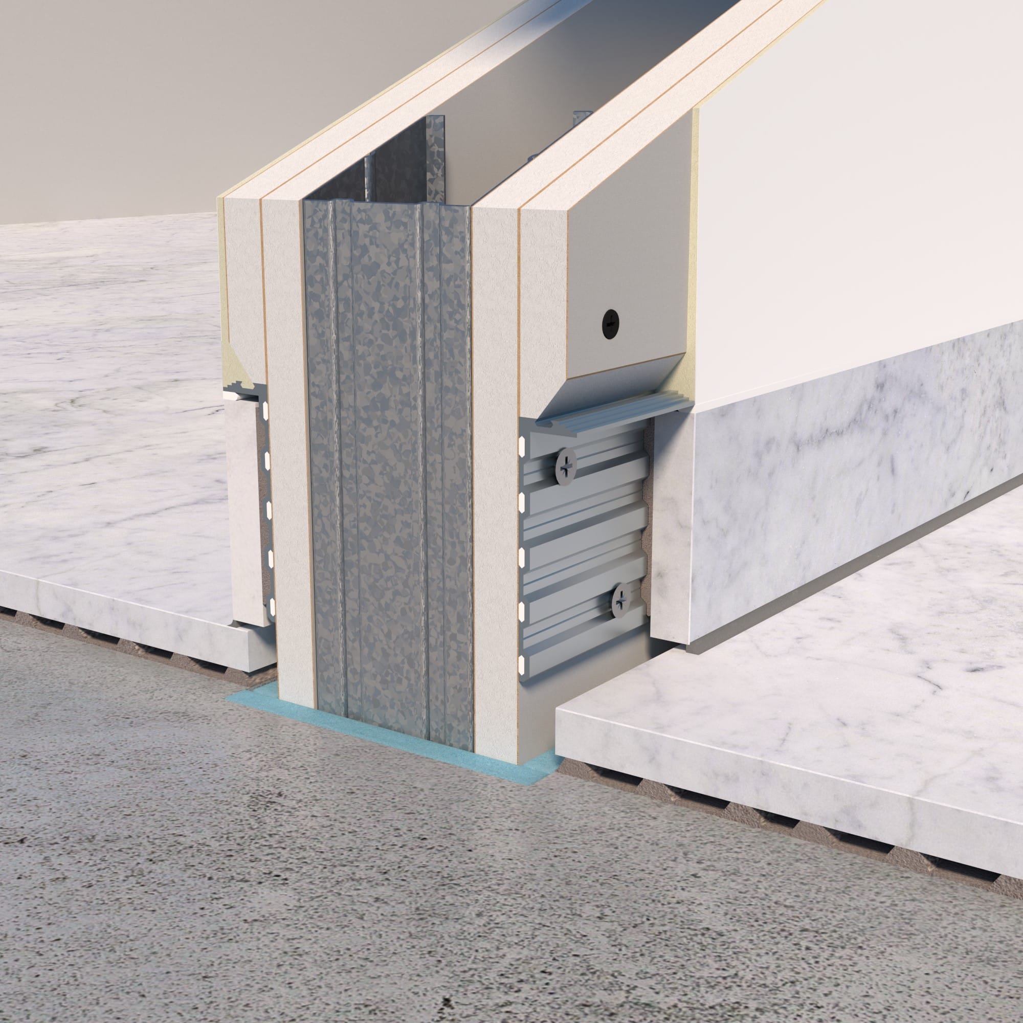 Montage des Aluprofils mit LINEA Systemkleber SK660, zusätzliche Verschraubung in den Metallständer. Die Gipskartonplatte wird an der Unterkante angefast und über das Aluprofil montiert nach der Herstellung des Bodenbelags wird die Sichtleiste in den Rücksprung geklebt und oben mit Acryl abgefugt.